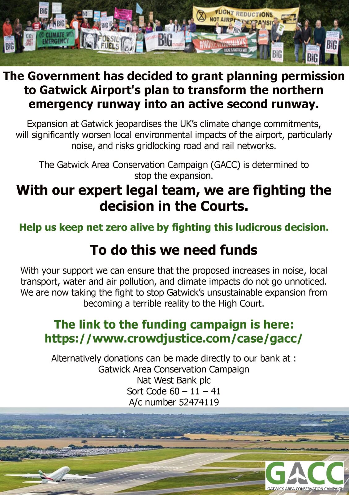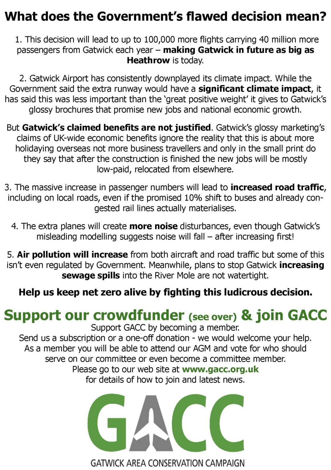 Gatwick Area Conservation Campaign (GACC) seeks your support following the Government decision to grant planning permission for a second runway at Gatwick Airport.