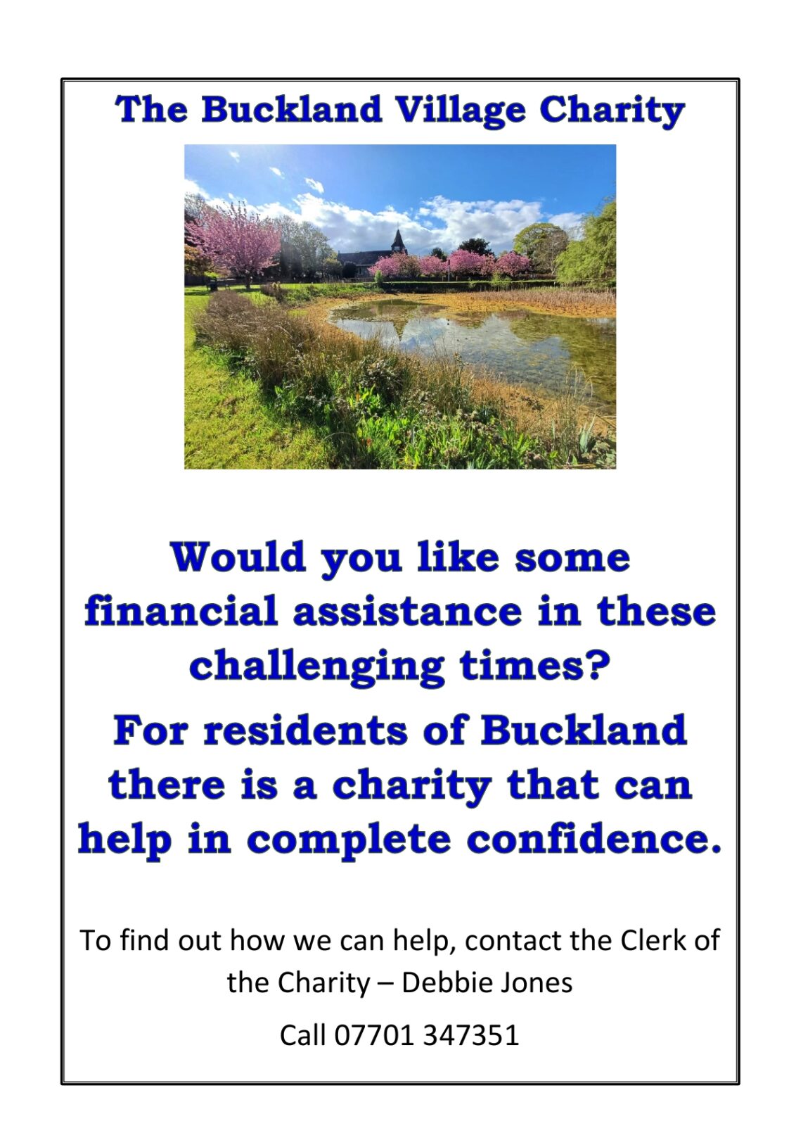 Our Parish Council is responsible for nominating four Trustees for the Village Charity; the current Trustees are Liz Vahey (Chair), Martin Boyce, Debbie Jones (Clerk) and Amanda Oakes-Smith. The Trustees meet several times a year to discuss any needs that have come to light and to agree distributions. There were distributions throughout 2023 to a number of Buckland residents and some one-off donations, principally to assist with utility bills and food.